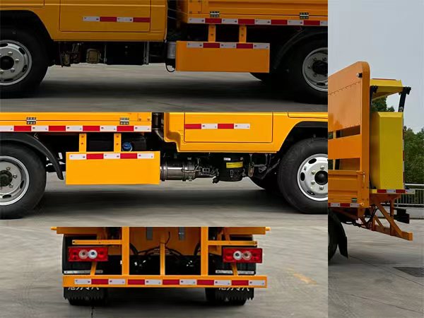 上裝配置:采用Q235國標邊3mm,底板花紋板4mm厚,不銹鋼合頁,箱體后部防撞緩沖模塊包采用國際知名技術產品70K防撞緩沖模塊,防撞緩沖吸能模塊主要由車載防撞緩沖墊和導向標志架組成,充當施工作業車輛后方的緩沖衛士。