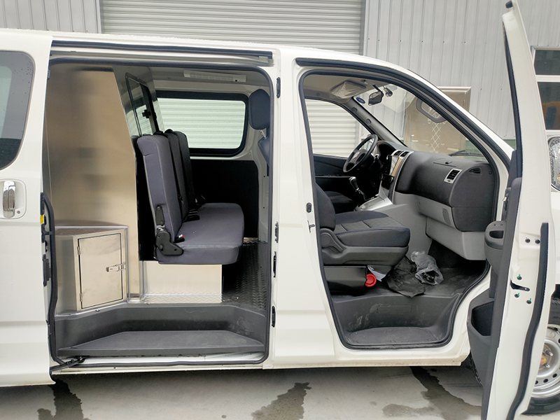 1、采用304D不銹鋼一次性沖壓件制作中隔墻(帶可滑玻璃窗),方便隨時觀察后倉 2、有不銹鋼工具箱,可放置隨車用品 3、前后包鋪304D不銹鋼地板 4、加裝304D車載制冷棺及擔架一副 5、細節(jié)可根據不同需求進行改裝 |